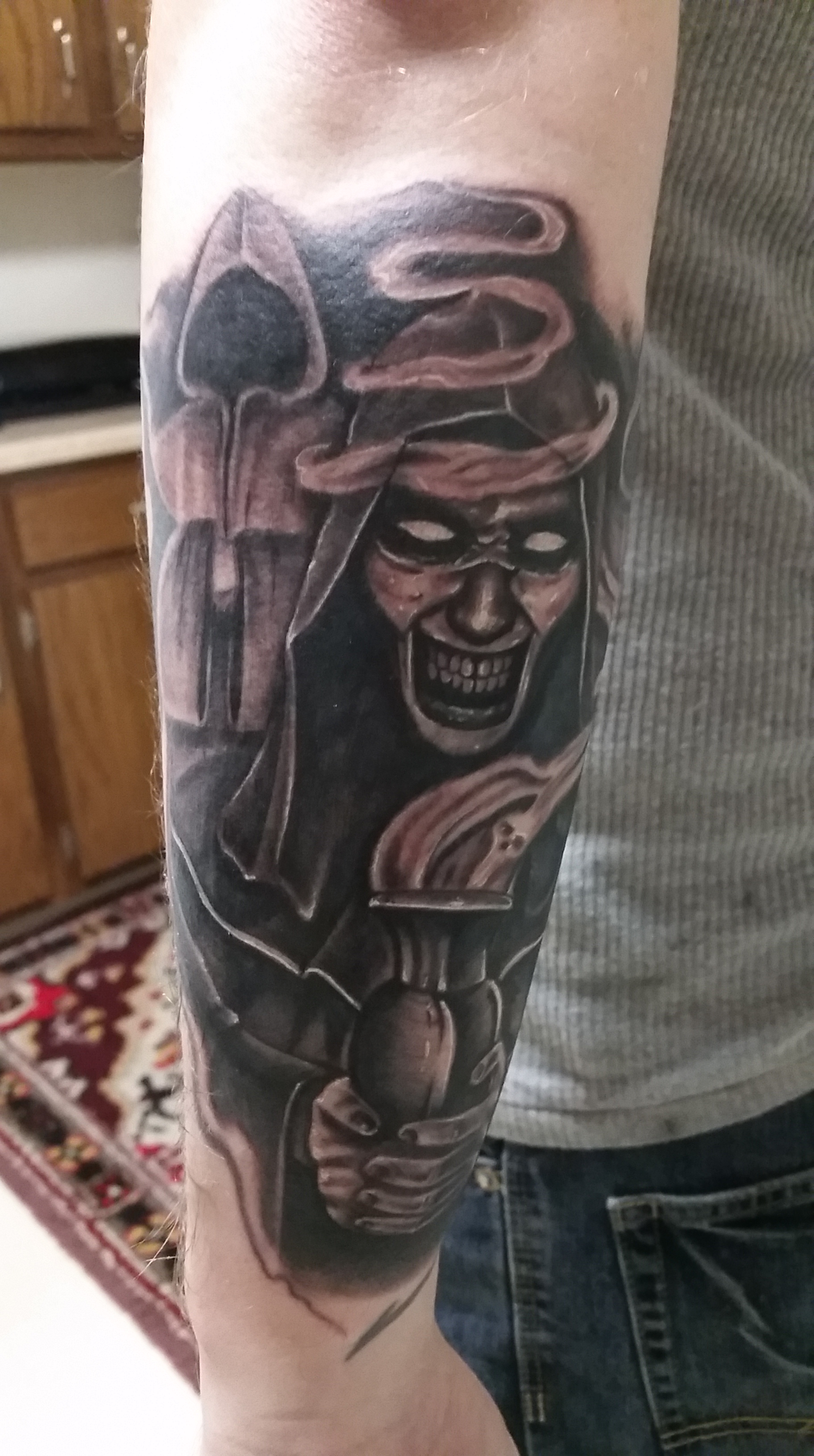 Since my writing career has seen some “success” and that I had plenty of extra space on my left arm that was just begging for ink, I decided to head on down to my tattoo artist, a sweet dude named Evan DiPalma, working out of About Time Tattoo and Piercing in my “wonderful” city of the Nash. To this point, Evan had done two smaller-ish tattoos for me, a chest piece from the video game Silent Hill: