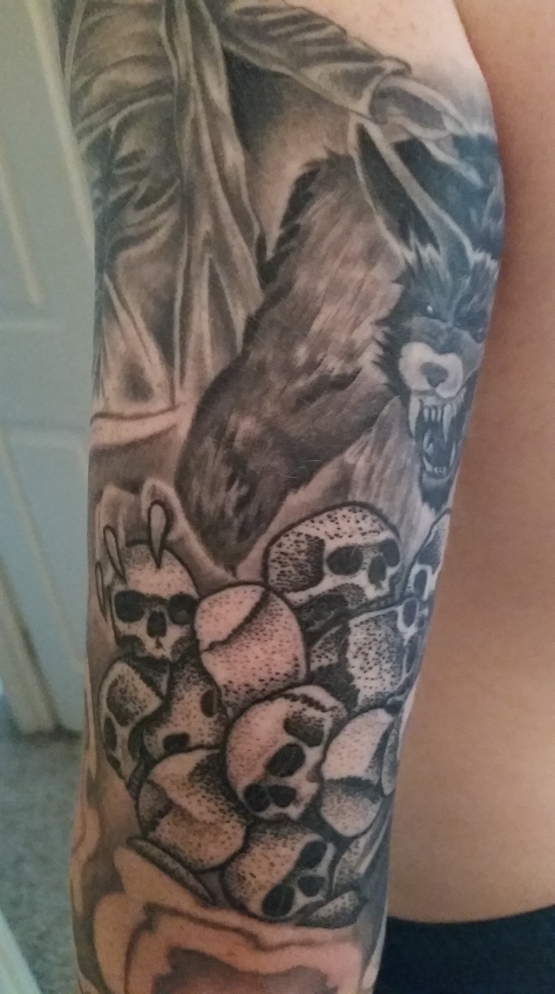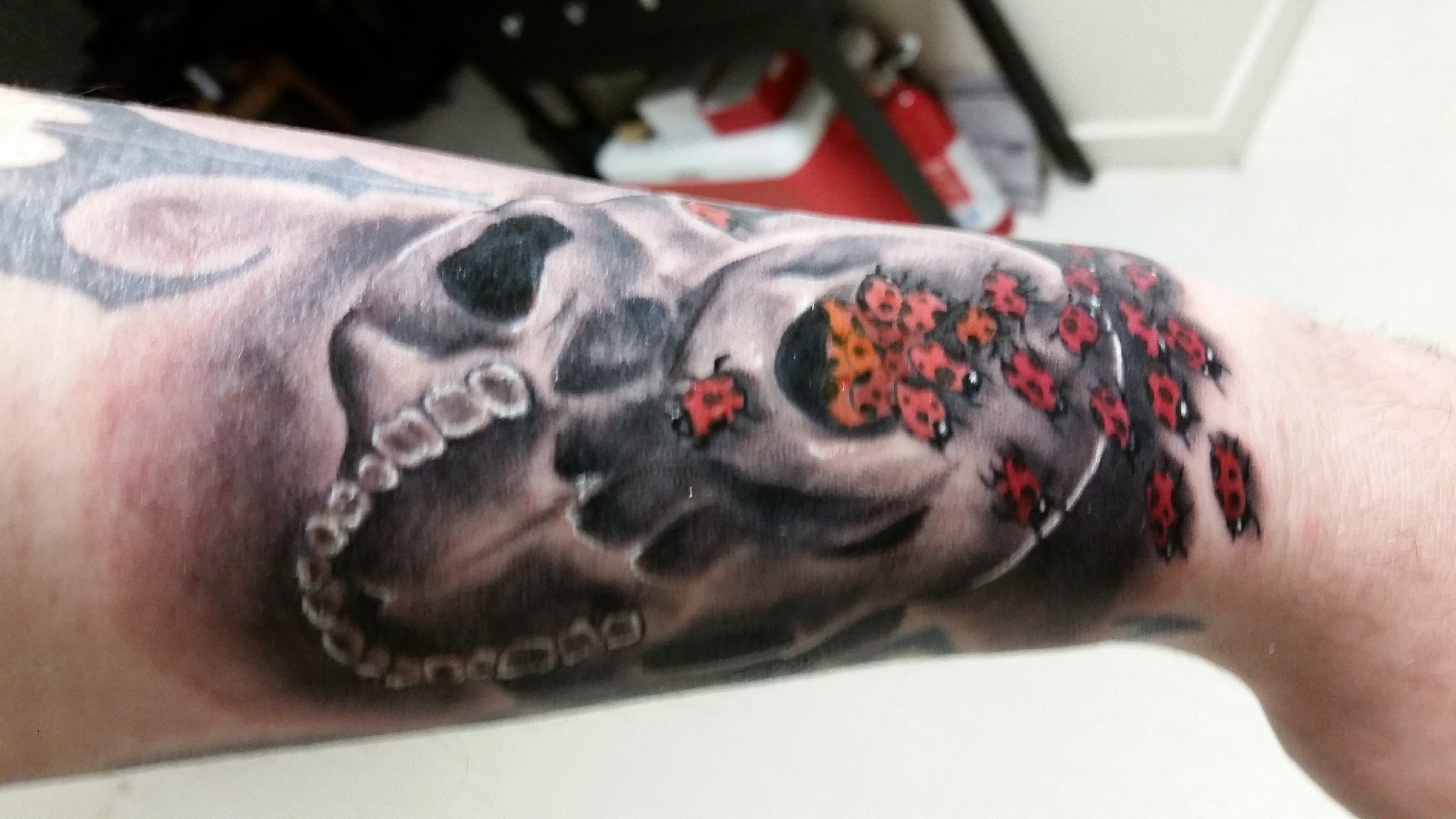 Fun Fact: The ladybugs are the only bit of color on my left arm. The idea was to counter-balance the Swamp Thing half-sleeve, which is vibrant with wonderful greens, blues, oranges, purples, pinks, etc, with gray scale. But, when Evan and I looked it over, we decided that the ladybugs needed to red. If you look closely, you can see the white dots of their eyes, too.